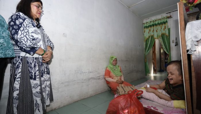 Ketua TP PKK Kota Pematangsiantar Ny Liswati Wesly Silalahi mengunjungi sekaligus memberikan bantuan kepada Sukma Adhany, di Kelurahan Kahean Kecamatan Siantar Utara, Rabu (25/02/2026). Sukma Adhani, perempuan berusia 25 tahun itu merupakan penderita Hydrocehalus (penumpukan cairan di rongga otak) sejak lahir.