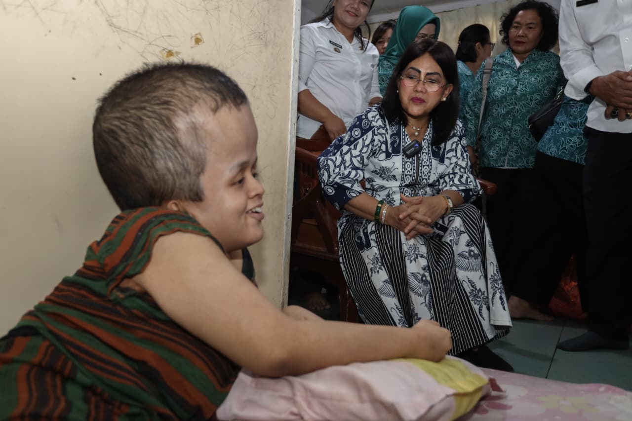 Ny Liswati Wesly Silalahi kunjungi Sukma Adhany, penderita Hydrocehalus, beri bantuan dan doa kesembuhan.