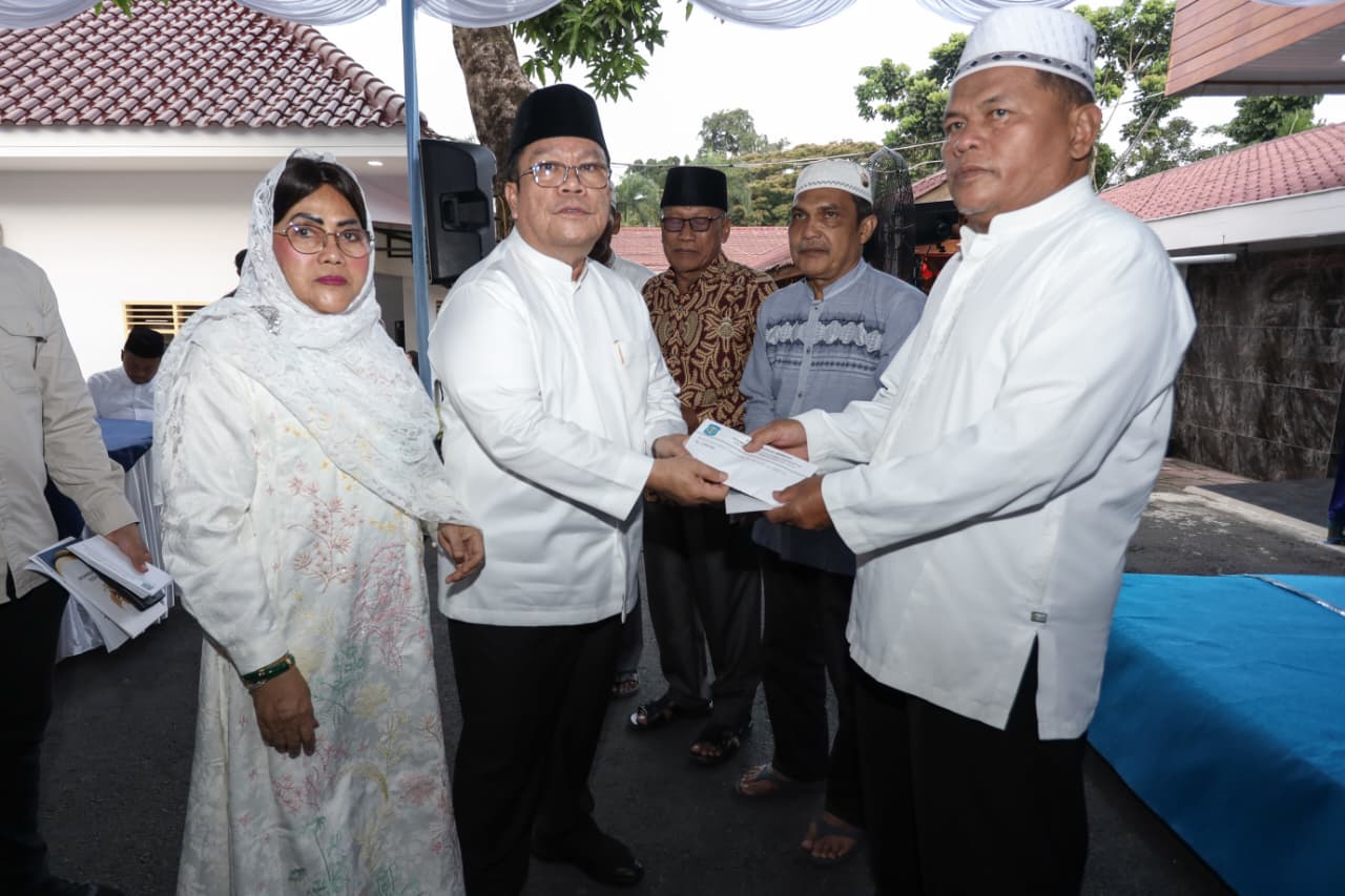 Wali Kota Pematangsiantar Wesly Silalahi SH MKn menyerahkan tali asih dan santunan kepada jamaah masjid, pengurus Badan Kemakmuran Masjid (BKM), dan para ustadz. Penyerahan tali asih dan santunan dilakukan di acara Ramadhan Berbagi Perumda Air Minum Tirta Uli Pematangsiantar, di rumah dinas Wali Kota Pematangsiantar, Jalan MH Sitorus Kelurahan Teladan Kecamatan Siantar Barat, Sabtu (28/02/2026).