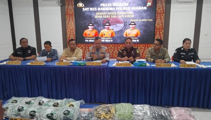 Kapolres Asahan AKBP Revi Nurvelani S.H S.I.K M.H., melakukan Press release ungkap kasus Narkotika jenis sabu dan Vape Liquid, di Aula Wira Satya Polres Asahan. Selasa, (03/03/2026)