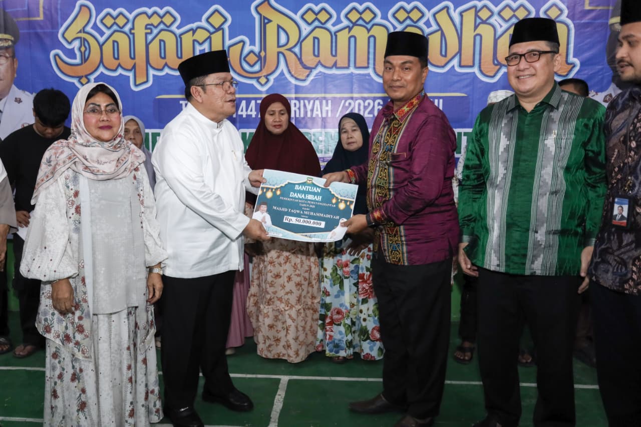 Wali Kota Pematangsiantar Wesly Silalahi SH MKn menyerahkan dana hibah Pemerintah Kota (Pemko) Pematangsiantar kepada Masjid Taqwa Muhammadiyah sebesar Rp50 juta. Dana hibah tersebut diserahkan di acara Safari Ramadhan Pemko Pematangsiantar di aula Masjid Muhammadiyah, Jalan Merdeka Kelurahan Dwikora Kecamatan Siantar Barat, Selasa (03/03/2026) sore.