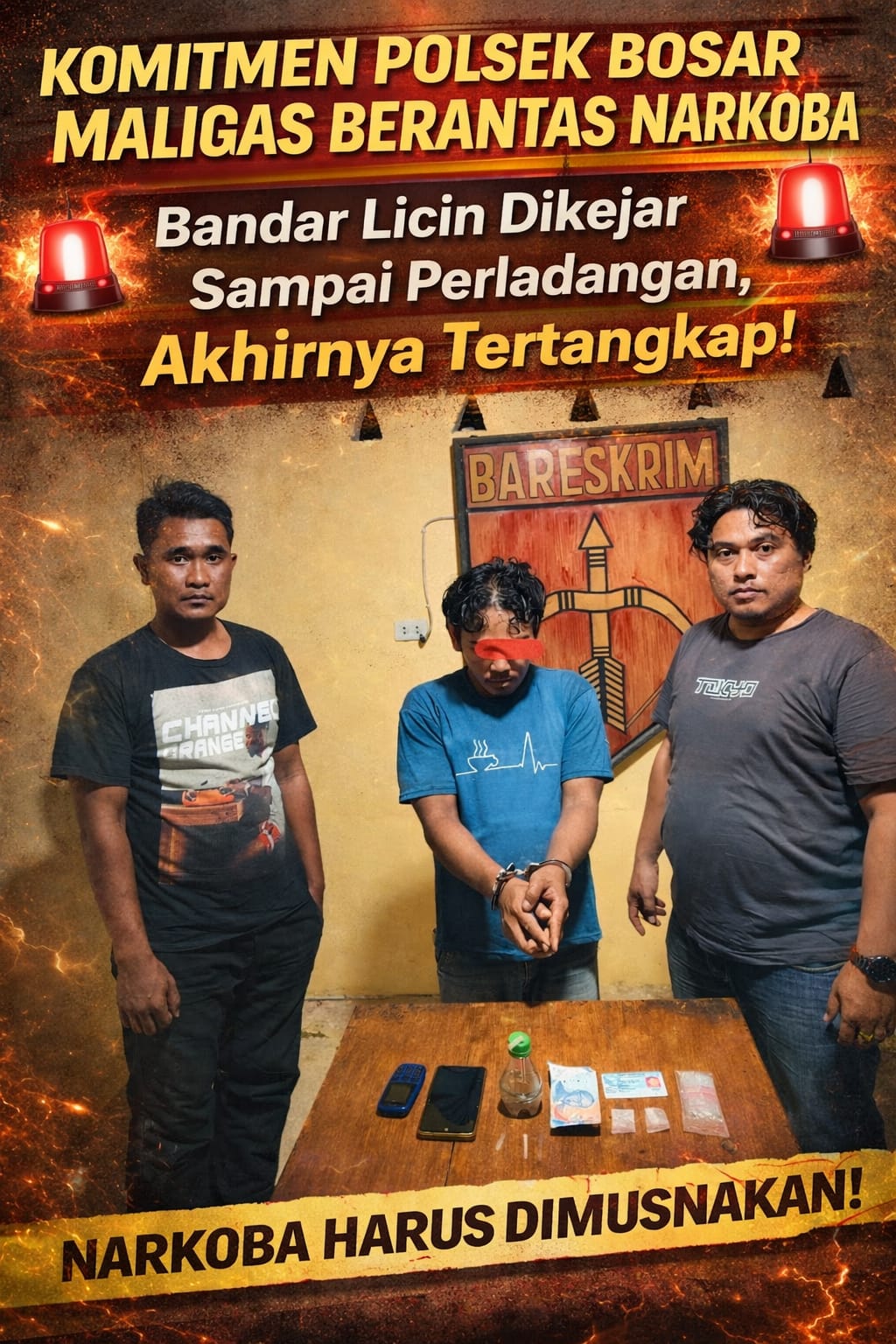 Bandar narkoba berinisial ANP (38) yang licin akhirnya berhasil ditangkap setelah kabur ke ladang sambil membuang bong dan kaca pirex berisi sabu pada Kamis malam, 5 Maret 2026, sekitar pukul 20.30 WIB di area perladangan Kecamatan Ujung Padang. Dipimpin langsung oleh Kapolsek Bosar Maligas IPTU Sonni G. Silalahi, SH, tim Reskrim yang dipimpin Kanit Reskrim IPDA Roy Jansen O. Sunggu, SH, berhasil mengejar dan menangkap ANP serta menyita 1,29 gram sabu plus barang bukti lainnya. “Polsek Bosar Maligas berkomitmen memberantas narkoba tanpa pandang bulu. Sekencang apapun bandar lari, kami akan kejar sampai dapat!” tegas Kapolsek.