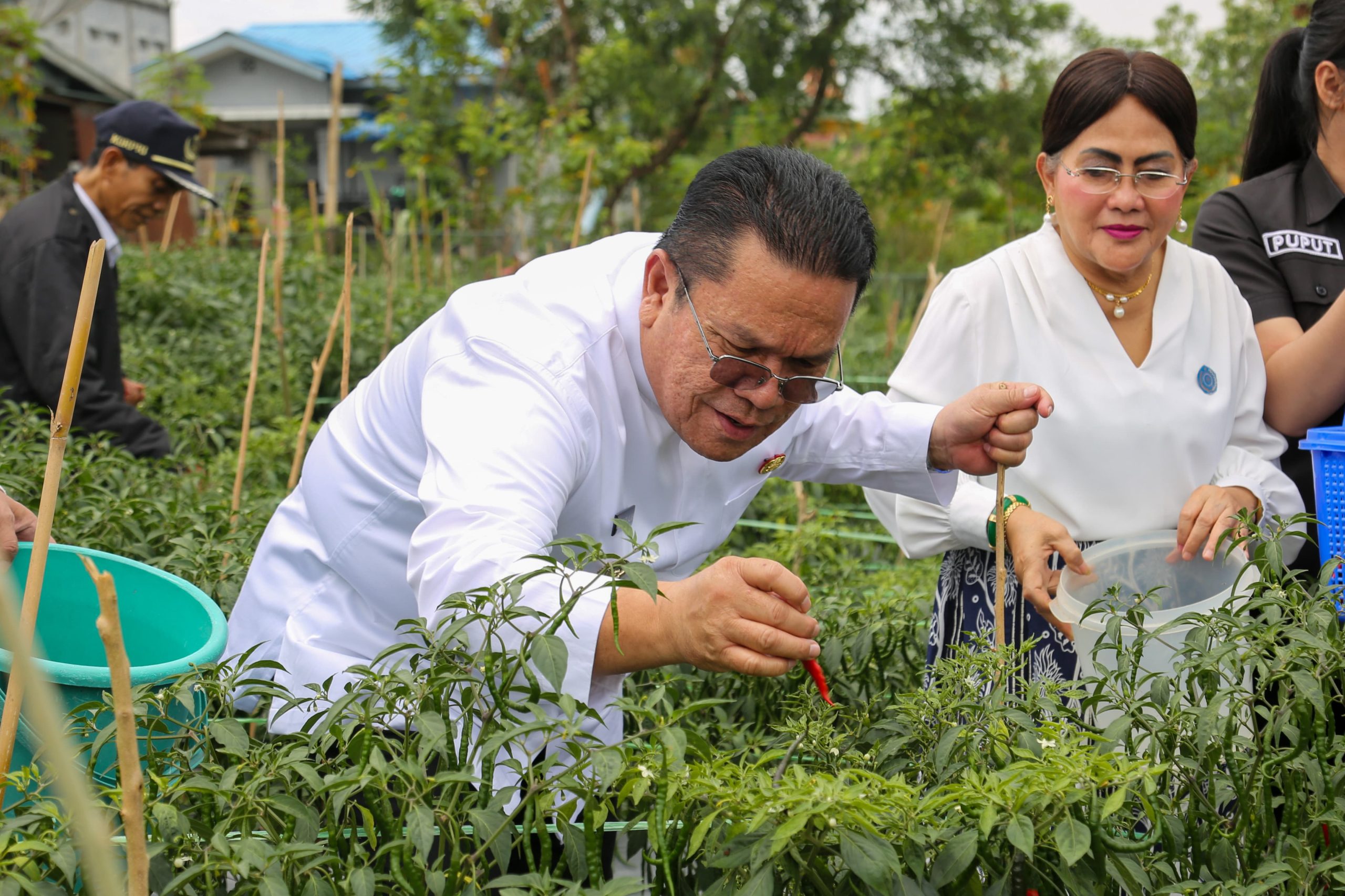 Didampingi Kepala Dinas Ketahanan Pangan dan Pertanian Drs Legianto Pardamean Manurung MAP, Wesly dan Ny Liswati memetik langsung cabai merah dari pohonnya. Tampak, tanaman cabai tumbuh subur dengan buah yang banyak dan ukurannya cukup besar.