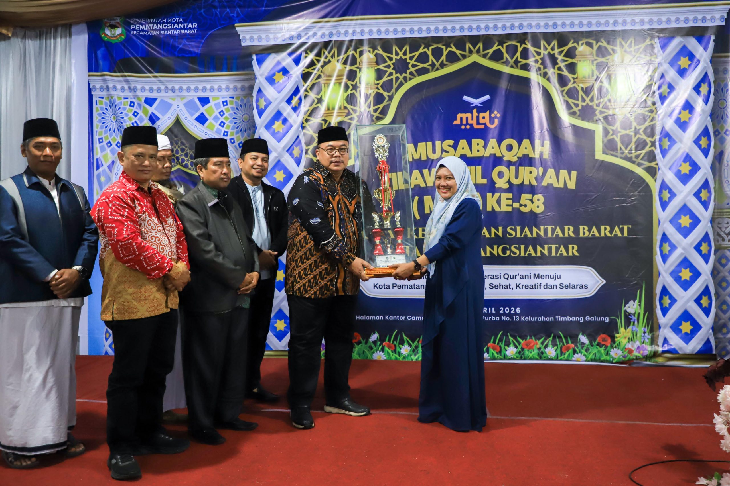 Kelurahan Timbang Galung menjadi Juara Umum Musabaqah Tilawatil Qur’an Nasional (MTQN) ke-58Tingkat Kecamatan Siantar Barat Kota Pematangsiantar. Piala bergilir diserahkan Wali Kota Pematangsiantar Wesly Silalahi SH MKn diwakili Asisten Administrasi Umum Setdako Dedy Tunasto Setiawan SH MH, yang sekaligus menutup pelaksanaan MTQN, di Kantor Camat Siantar Barat, Jalan Purba Kelurahan Timbang Galung, Kamis (09/04/2026), malam.