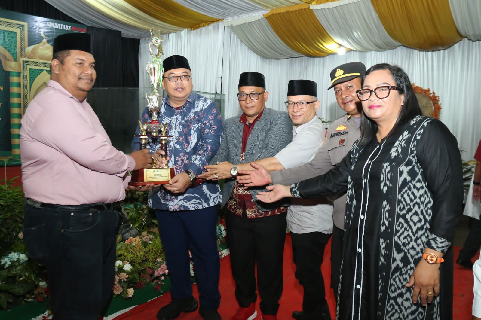 Turut serahkan piala: Kabag Kesra Setdako Irwansyah Saragih mewakili Ketua LPTQ, Camat Pedi Arianto Sitopu, Ketua TP PKK Kecamatan Ny Evi Pedi Sitopu, serta unsur Forkopimca Siantar Marihat. (***)