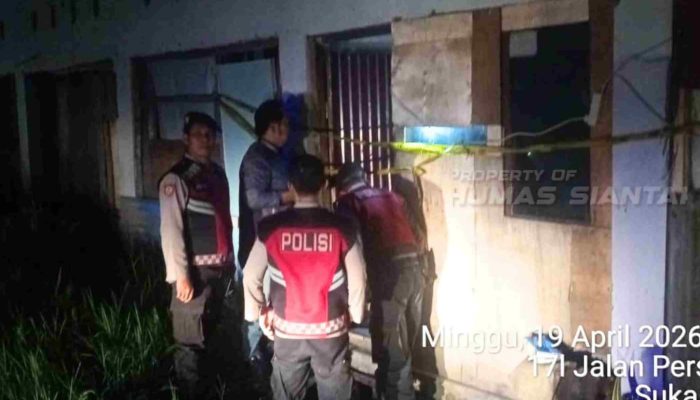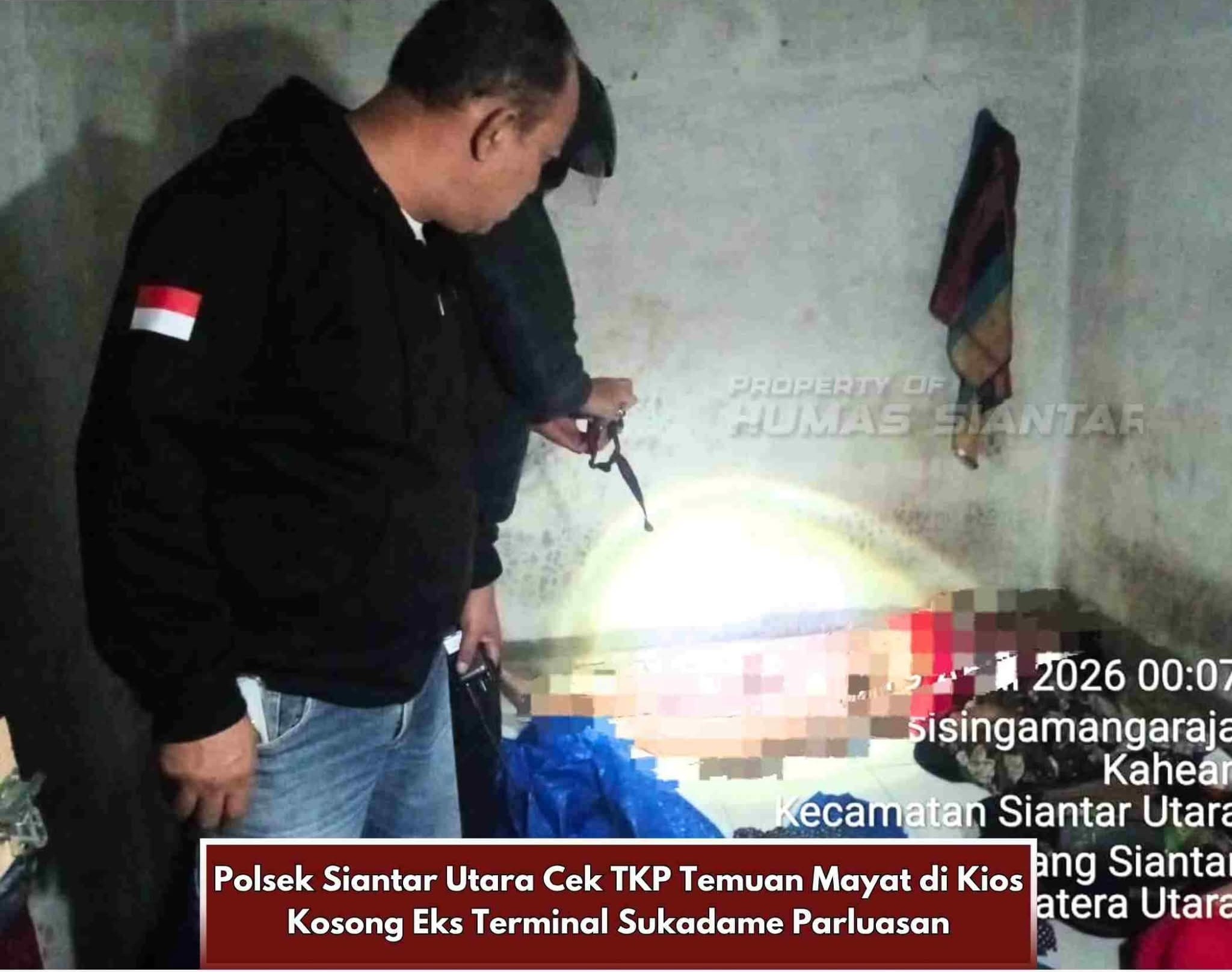 Personel piket Polsek Siantar Utara Polres Pematangsiantar cek TKP temuan mayat di kios kosong eks Terminal Sukadame, Jalan Persatuan Kelurahan Sukadame, Kecamatan Siantar Utara, Sabtu 18 April 2026 pukul 23.30 WIB.