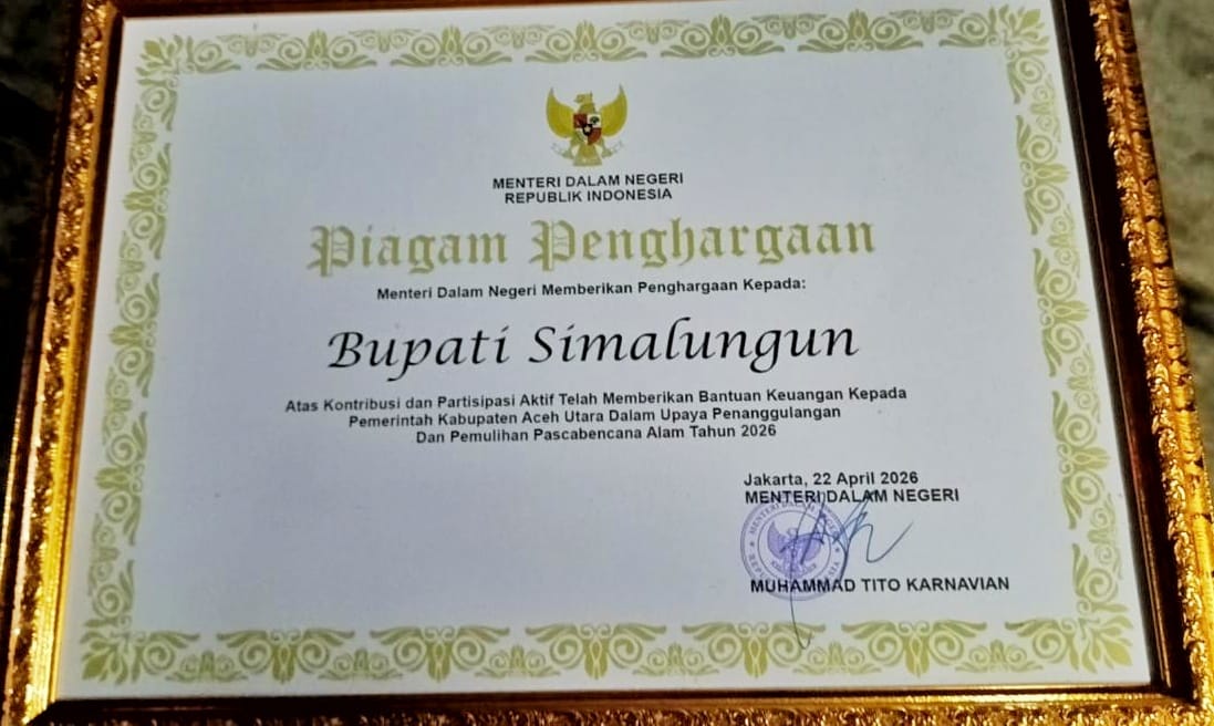 Penghargaan diberikan atas peran nyata Pemkab Simalungun yang menyalurkan bantuan keuangan ke Pemkab Aceh Utara untuk penanggulangan dan pemulihan dampak bencana alam tahun 2026. Kemendagri nilai langkah itu cerminan kepedulian dan semangat gotong royong antardaerah.