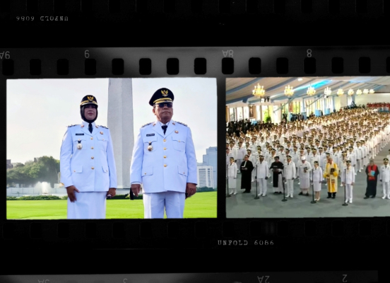 Ratusan kepala daerah tiba dengan pawai baris berbaris dari Monumen Nasional (Monumen) menuju gerbang Istana Merdeka, menyeberang Jalan Medan Merdeka Utara. Mereka, termasuk Wesly-Herlina mengenakan Pakaian Dinas Upacara Besar (PDUB) dan topi hitam.