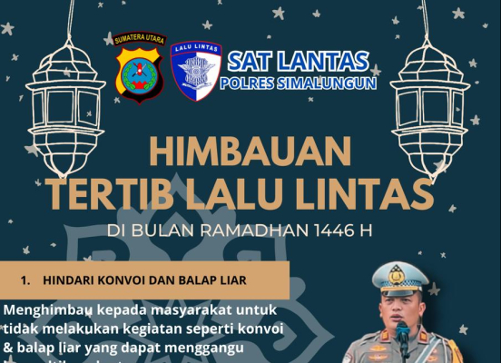 Menyambut bulan suci Ramadhan 1446 H/2025 M, Polres Simalungun mengeluarkan imbauan tertib lalu lintas untuk menjaga keamanan, keselamatan, ketertiban, dan kelancaran lalu lintas (Kamseltibcarlantas) di wilayah hukum Polres Simalungun. Himbauan tersebut disampaikan oleh Kasat Lantas Polres Simalungun AKP Jonni Fatiaro H Sinaga, SH, sebagai upaya profesional Polri dalam pengamanan kamtibmas.
