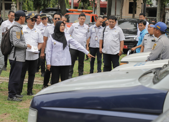 Didampingi Kepala Bidang Aset Badan Pengelola Keuangan dan Pendapatan Daerah (BPKPD) Kota Pematangsiantar Alwi Adrian Lumbangaol SSTP dan Kepala UPT Samsat Pematangsiantar Badan Pendapatan Daerah (Bapenda) Provinsi Sumatera Utara (Sumut) Fuad Ghazali Damanik SSTP MSi, Herlina berkeliling memeriksa kendaraan dinas yang terbaris rapi.
