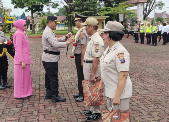 Polres Simalungun menggelar upacara bendera bulanan sekaligus pelepasan purna bakti tiga personel di lapangan apel Markas Komando (Mako) Polres Simalungun, Jalan Jhon Horailam Saragih, Pematang Raya, Kecamatan Raya, Kabupaten Simalungun, Rabu (9/4/2025).