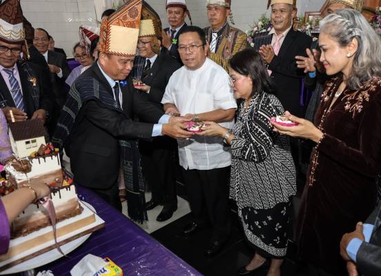 Sebelum meninggalkan Gereja GKPS Jalan Jenderal Sudirman, Wesly dan Sah Udur menerima Dayok Nabinatur (penganan khas Simalungun) yang diserahkan Sekjen GKPS Pdt Dr Paul  Ulrich Munthe bersama Pimpinan Majelis Jemaat. (ril/th)