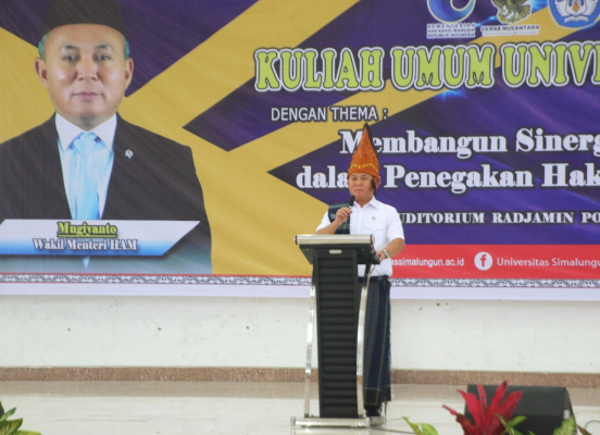 Wakil Menteri Hak Asasi Manusia (Wamen HAM) Mugiyanto Sipin memberikan Kuliah Umum di Universitas Simalungun (USI). Kuliah umum yang berlangsung di Auditorium Radjamin Poerba Kampus USI, Jalan Sisingamangaraja Kota Pematangsiantar, Jumat (16/05/2025) siang. Acara ini dihadiri Wali Kota Pematangsiantar Wesly Silalahi SH MKn diwakili Wakil Wali Kota (Wawako) Herlina. Kuliah umum tersebut dirangkai peresmian Pusat Studi HAM USI.