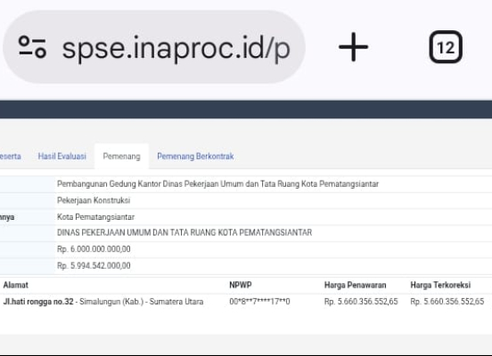 Sementara itu, proyek Rehabilitasi Berat Gedung Kantor Camat Siantar Barat dengan nilai pagu sebesar Rp 2,5 miliar diketahui dibatalkan. Informasi pembatalan tender ini dapat dilihat langsung melalui situs resmi LPSE di alamat spse.inaproc.id. Kondisi ini pun menambah kecurigaan publik akan adanya permainan dalam proses pengadaan barang dan jasa di lingkungan Pemko Pematangsiantar.
