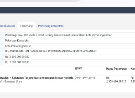 Rehabilitasi Berat Gedung Kantor Camat Siantar Barat dengan pagu anggaran sebesar Rp 2,5 miliar sebelumnya telah diumumkan dengan keputusan hasil “Dibatalkan”, melalui situs resmi spse.inaproc.id/p pada 7 Juli 2025. Namun hanya berselang dua hari, tepatnya pada 9 Juli 2025, hasil pemenang tender justru kembali diumumkan.