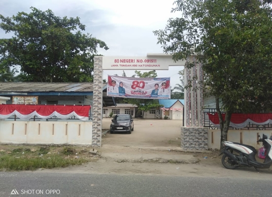 Sekolah Dasar Negeri Jawa Tongah Kecamatan Hatonduhan Kabupaten Simalungun membuat dan memasang bendera di tembok sekolah.
