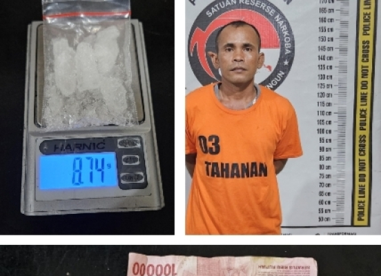 Barang bukti yang berhasil diamankan meliputi satu bungkus plastik klip besar berisi diduga narkotika jenis sabu dengan berat brutto 8,74 gram, satu unit handphone Android merek Vivo warna hitam, uang tunai Rp 200.000 yang diduga hasil penjualan, satu bal plastik klip kosong, satu buah dompet kecil, dan satu unit timbangan digital.
