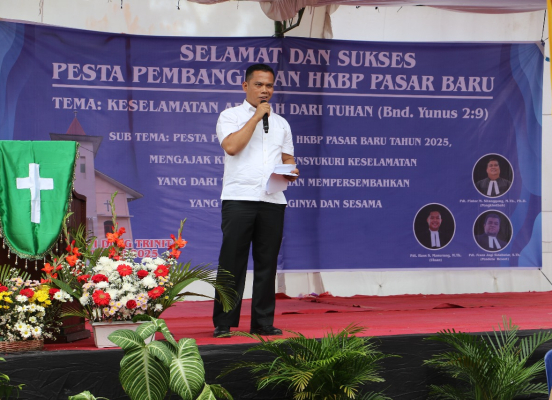 Wali Kota Pematangsiantar Wesly Silalahi SH MKn diwakili Sekretaris Daerah (Sekda) Junaedi Antonius Sitanggang SSTP MSi menghadiri Pesta Pembangunan HKBP Pasar Baru Resort Sintanauli, Jalan Bunga Lawang Kelurahan Naga Huta Kecamatan Siantar Marimbun, Minggu (12/10/2025).