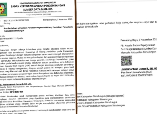 Beredar surat edaran palsu mengenai Pemberitahuan Mutasi dan Penataan di Bidang Pendidikan Pemerintah Kabupaten Simalungun. Surat dengan nomor 800.1.1.3/247/BKPSDM/2025 tertanggal 3 November 2025 ini ditujukan kepada Kepala SD Negeri 098166 Perumnas dan SD Negeri 095135 Sipolha.