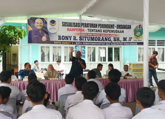 Anggota DPRD Sumut, Ronny R. Situmorang, SH., M.IP, mensosialisasikan Rancangan Peraturan Daerah (Ranperda) Kepemudaan di SMK Muhammadiyah 2. jalan merdeka Pematangsiantar pada Senin (17/11/2025) siang. Ia menyebut regulasi ini penting sebagai payung hukum bagi penyusunan dan penganggaran program pengembangan pemuda di Sumatera Utara.