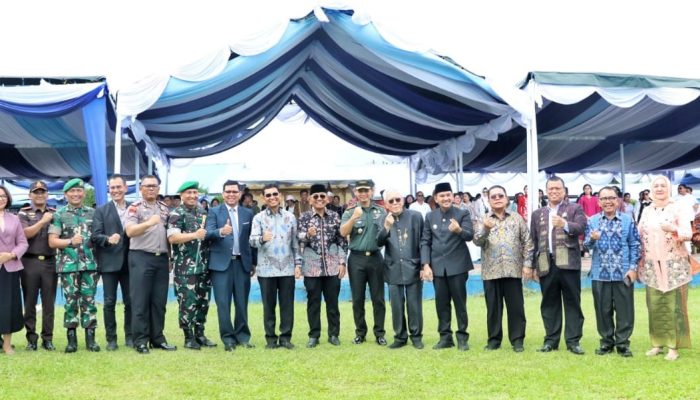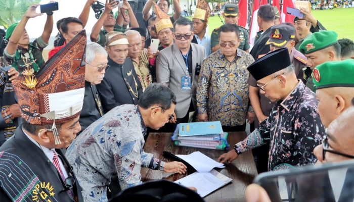 Acara kemudian melangkah ke momen krusial yaitu penandatanganan berita acara penyerahan simbol-simbol pahlawan nasional oleh ahli waris dan Ketua Umum Ihutan Bolon HSGP, Dr. Jr. Saragih, kepada Bupati Anton Achmad Saragih.