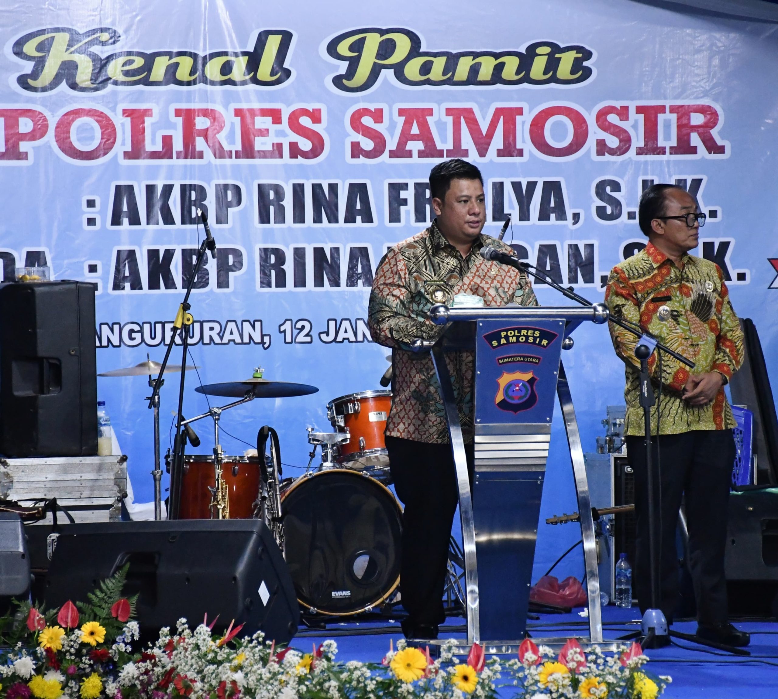Bupati Samosir Vandiko T. Gultom bersama Wakil Bupati Ariston Tua Sidauruk menyambut kehadiran Kapolres Samosir yang baru, AKBP Rina Sry Nirwana Tarigan, S.I.K., sekaligus melepas Kapolres Samosir lama, AKBP Rina Frillya, S.I.K., yang mendapat amanah baru sebagai Kapolres Tebing Tinggi.